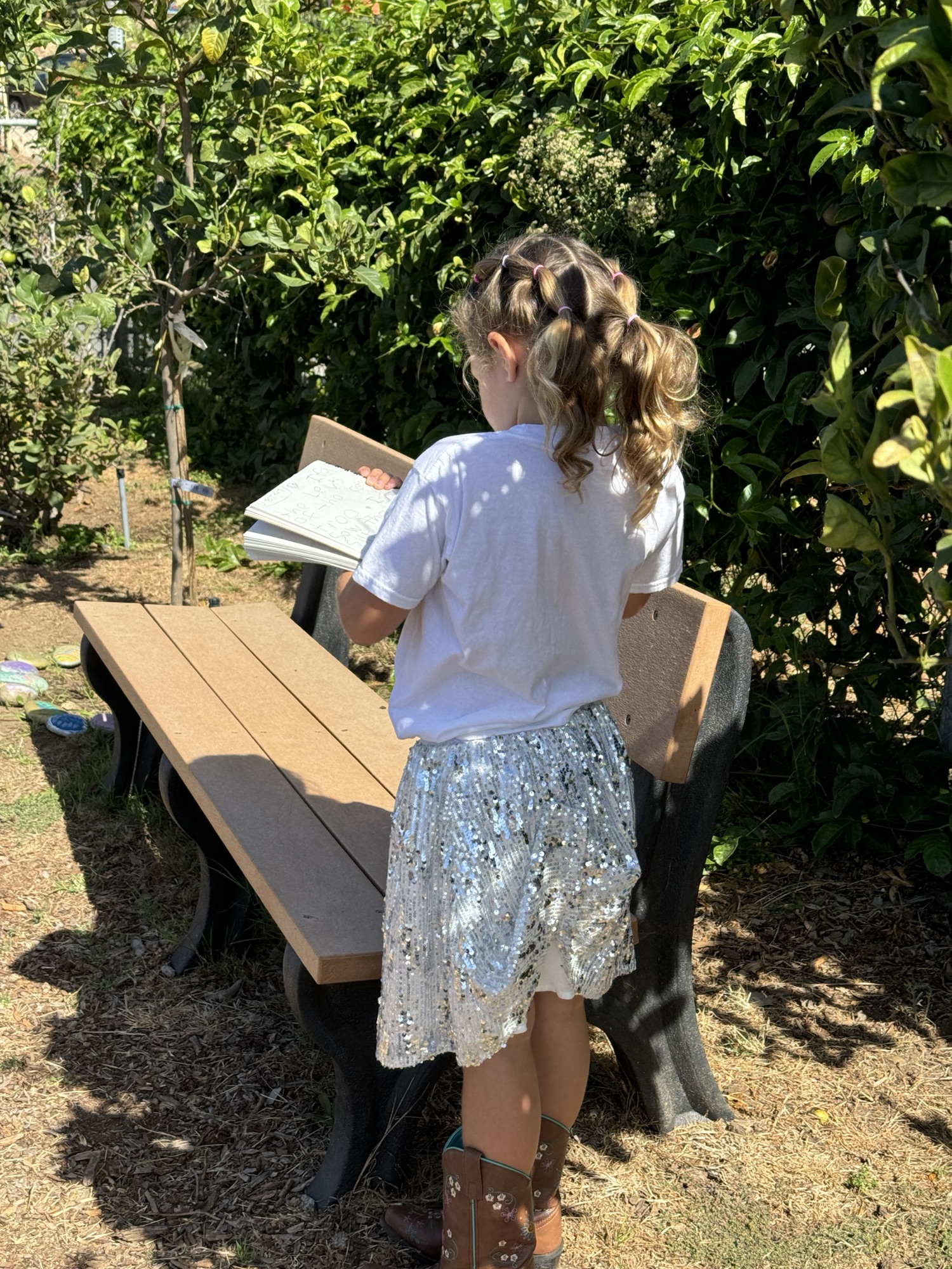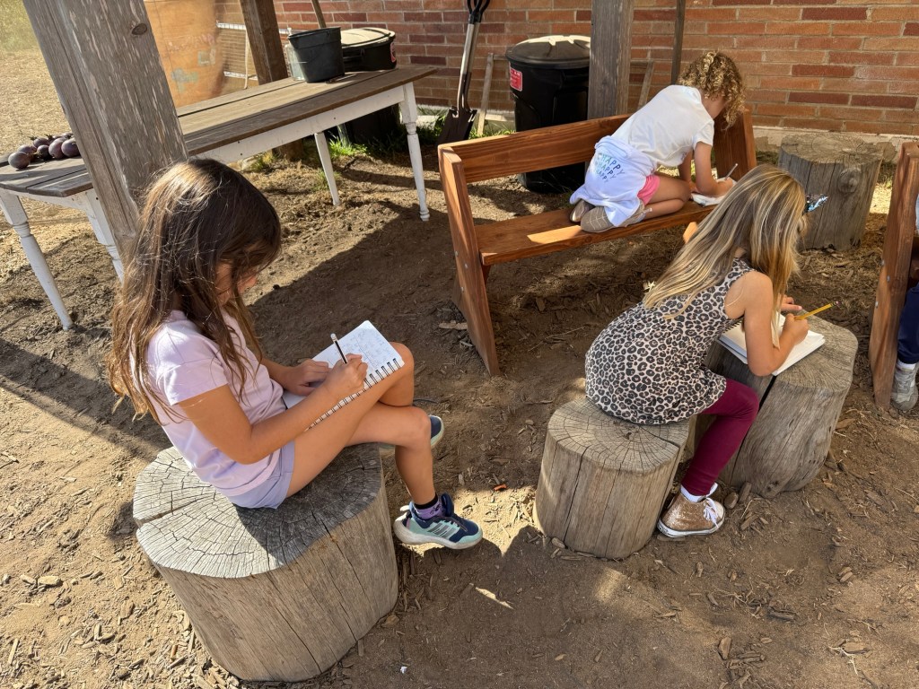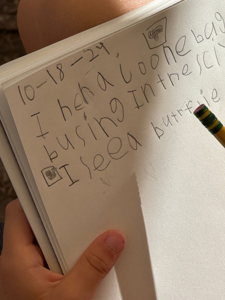 I love watching my students develop stamina and confidence as writers. There is something freeing and motivating about writing outdoors, writing in a sketchbook, sitting on a stump, and even writing standing up. Writing still takes effort when you are six or seven. Putting all that wonderful thinking onto the page is an opportunity to put phonics into action, exercise those developing fine motor skills, and focus attention for a sustained period of time.