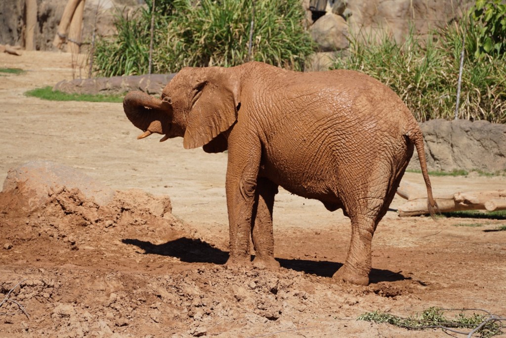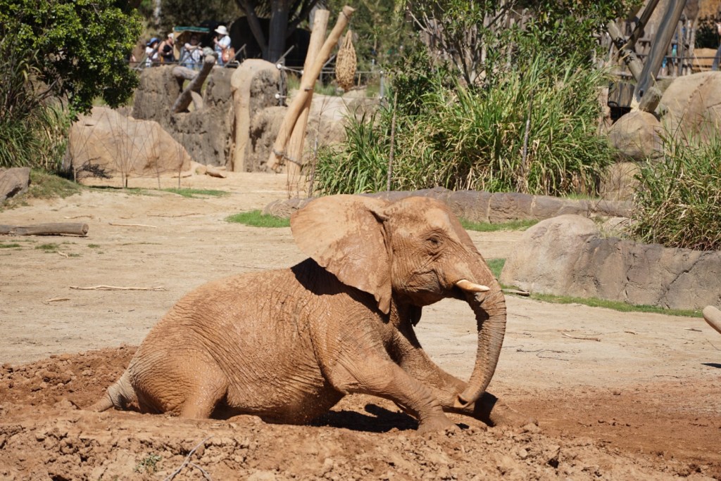 The elephant keepers were doing some enrichment/training with the elephants, creating spectacular moments for visitors. And afterwards, the elephants clearly needed to cool off. As we sat we watched one of the teenaged elephants head over to the mud hole and start rolling and splashing the mud all over. Watching these huge animals nimbly get down to the ground and play in the mud is a delight! We could hear the echoes of laughter as visitors enjoyed the spectacle. Then another elephant moves toward the mud–a hole clearly big enough for one, but for two? We watch the elephants nudge and push until they fall into a full-on wrestling match, playful and muddy, trunks swinging, mud flying. At some points butt to butt, fully enjoying the cool mud and each other as they played together in the not-quite-big-enough-for two mud hole.