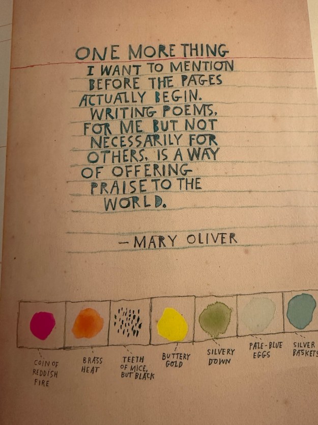 In addition to the gorgeous illustrated poem, this book also includes back pages. It includes Mary Oliver’s poem written in its standard way along with a copy of a bird list written by her. There is also a note from Melissa Sweet that begins with the Mary Oliver quote:
