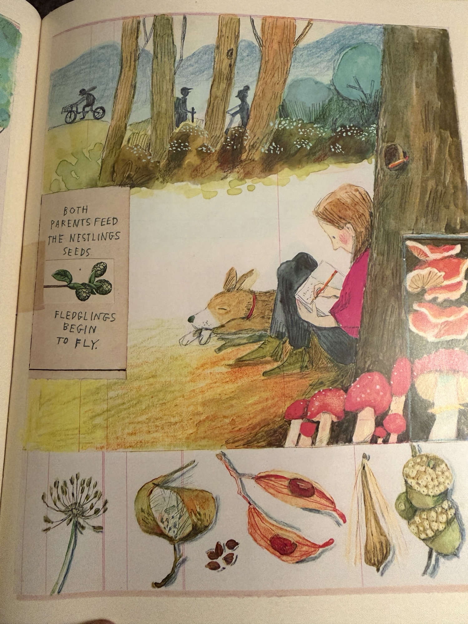 The note includes Melissa’s process of research and learning about goldfinches so she could effectively illustrate the poem along with descriptions of Mary’s forays into the woods as a child–even stashing pencils in trees so she would always have one to write things down when inspiration struck. I love that Melissa Sweet creates pages that are like a nature notebook, including notes about the birds along with illustrations of plants.