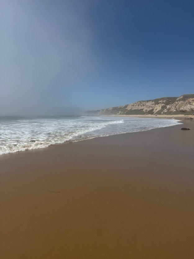 Near the end of the stretch of beach we walked, the sun prevailed and we stopped to watch surfers, seemingly too close to the cliffs, ride waves and duck into the brilliant translucent tubes of water. We headed back, finding the fog again…a little less dense this time. At one point I noticed the beach split between the fog and sun.