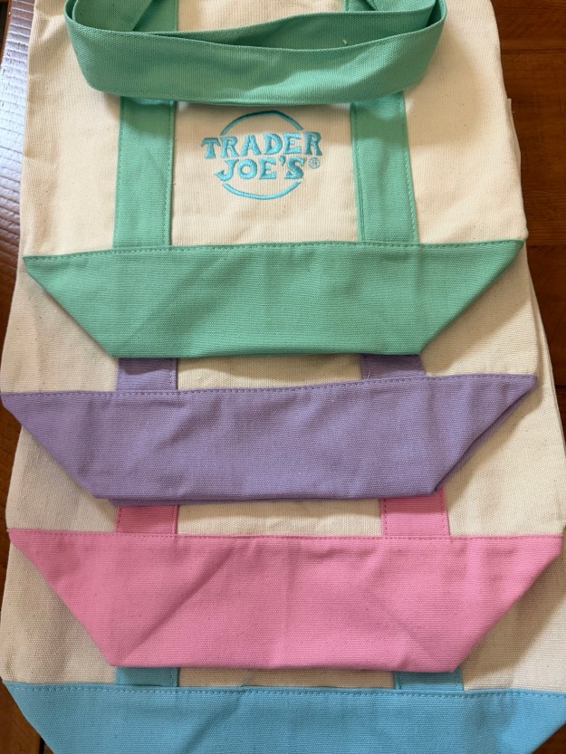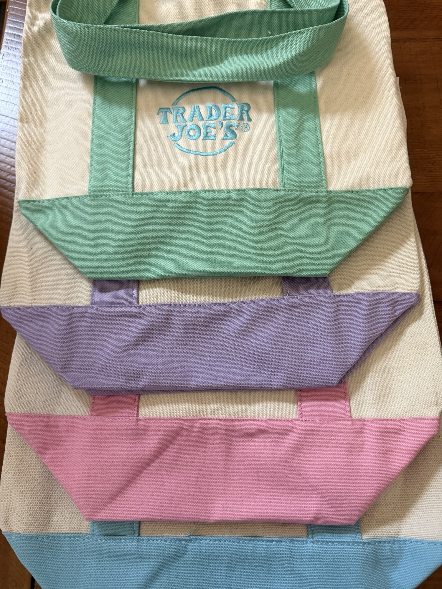 Yesterday we went to walk at a beautiful state beach in Laguna–and nearby there is a wonderful Trader Joes. It has all the usual TJ qualities including fresh flowers, interesting snacks, 99 cent greeting cards (that are actually good), and everything you need to make an easy, tasty dinner. In addition, it also has large stand-up freezers with doors (most other TJs have the low reach-in variety that you look down into) which also seems to mean that they have a larger selection of frozen items. They also stock artisan bread from a local bakery (yum!)–definitely worth stopping in when in the area. Yesterday we had the bonus perk of finding spring colored mini bags! I have no idea what I will do with them…yet!