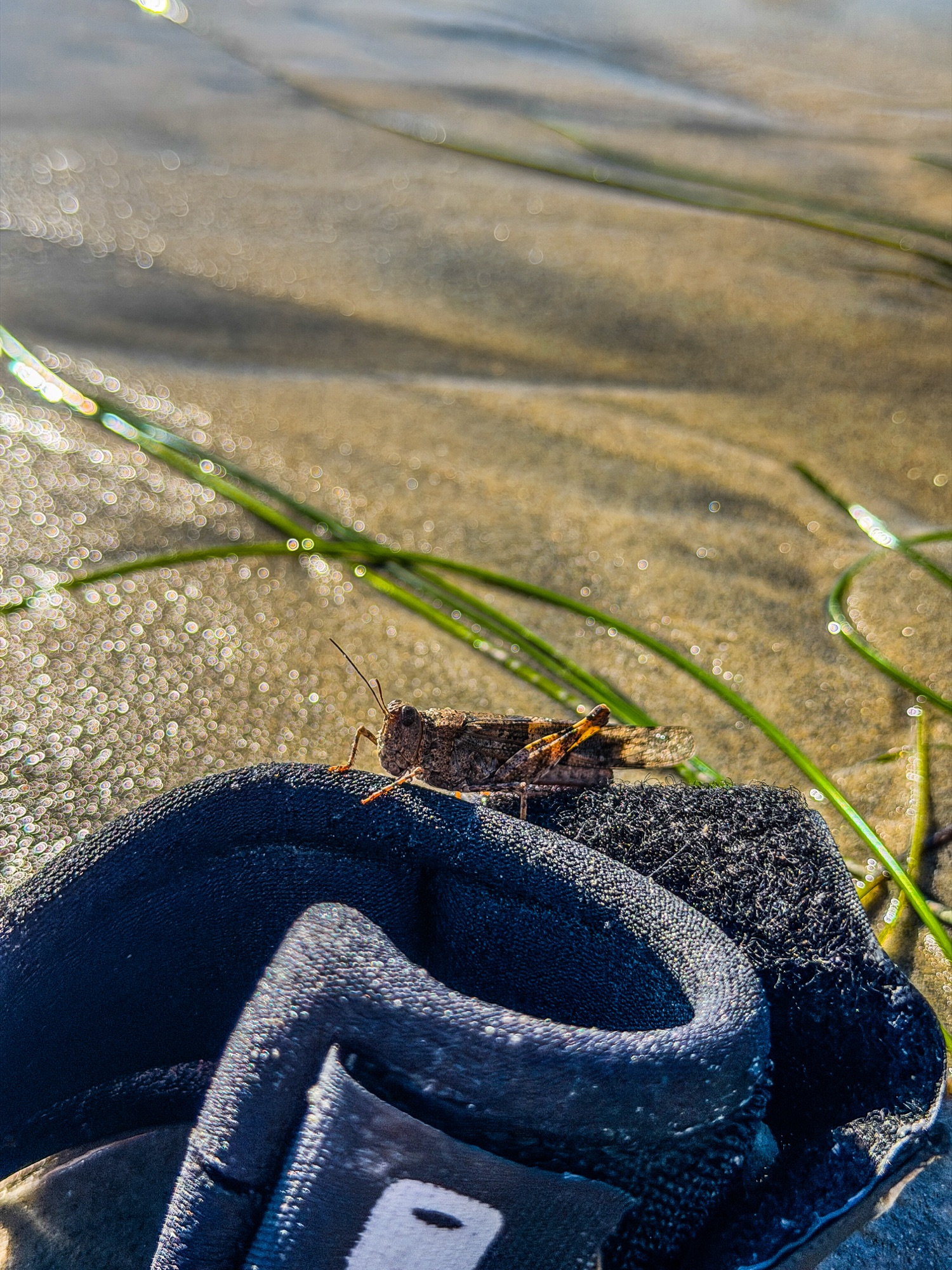 As we meandered along the shore I noticed a grasshopper perched on an abandoned piece of surfboard leash. What? Grasshoppers are not usual beach inhabitants. I leaned in close, trying to get a grasshopper portrait without making it leap away. I wanted to get close enough to see details and not capture that blur that happens when the focus and distance don’t line up. After a few tries, I got this unexpected shot.