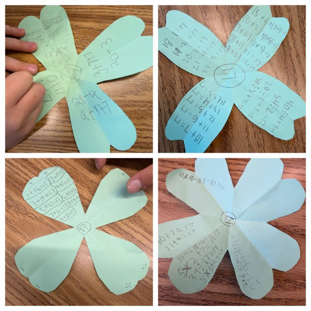 We did some folding and cutting to create some lucky 4-leaf clovers–after we talked about their magical qualities (many of the first graders said they had experienced finding these rare and magical items). Most students were successful right away, and those who weren’t got theirs to come out whole on their second attempt. Then we turned them into some fun math. They wrote the number 17 in the middle (after all, it is March 17th) and then wrote math problems that equaled 17. Another unexpectedly fun and successful activity.