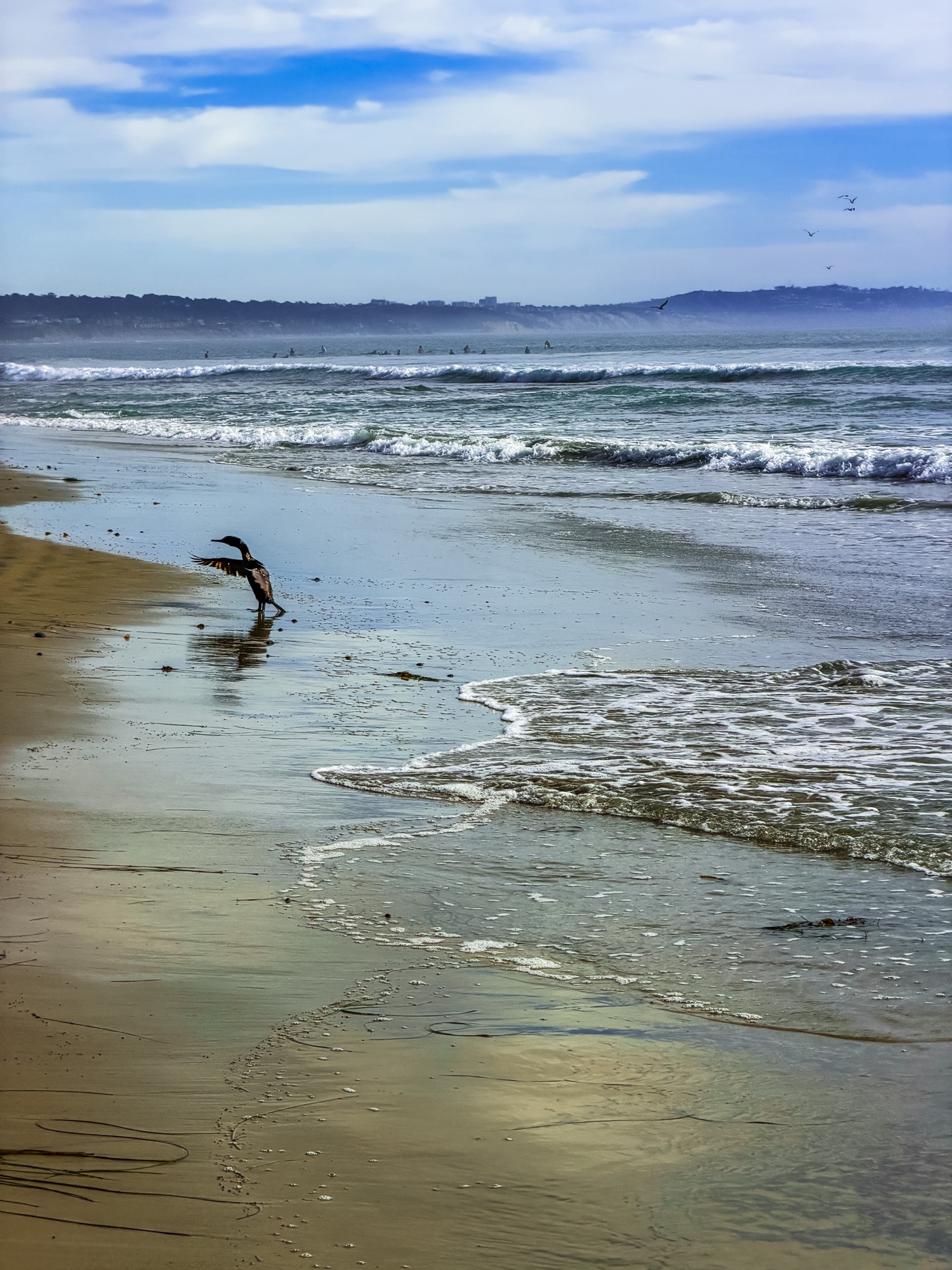In the last few days it has been cormorants that I keep seeing on the beach. I don’t think they are technically shore birds, I more commonly see them flying over the beach or sunning themselves on piers or in lagoons. They are described as strong swimmers and they have these big, awkward webbed feet that are definitely not ideal for walks on the beach!