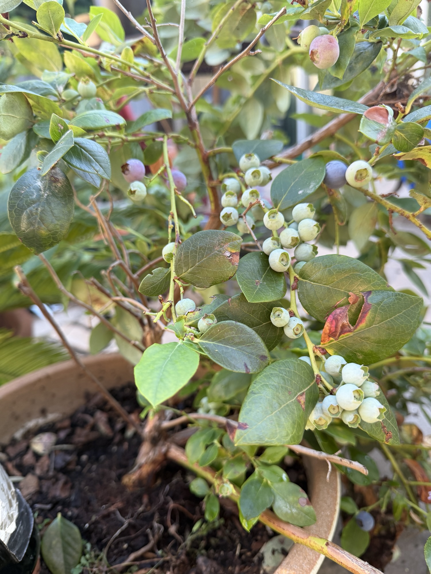 The blueberry plants have been a challenge. We started with one expensive one, and it promptly tried to die. We adopted a cheaper brother for it and now both seem to be doing great. They each have a wine bottle waterer in their pots to keep them from dying of thirst and they are both jam-packed with blueberries right now! (Is it blueberry season? Is there a blueberry season in Southern California?)