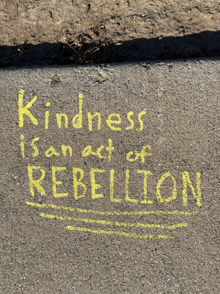What does it mean for kindness to be an act of rebellion? I’m struck by the contrast with the way our current government acts. The contrast between kindness and war, kindness and threats, kindness and taking children from their families, kindness and lying. I’d love to believe that kindness could cure so many of our societal ills. At least, it might be a starting point. My colleague reminded me today (before I saw this message on the sidewalk) that she tells her kindergarten students, “Be kind or be quiet.” It is kind to stand up for what is right. It’s not kind to call names and diminish your classmates. (There is a bigger message there when it comes to grown ups.)