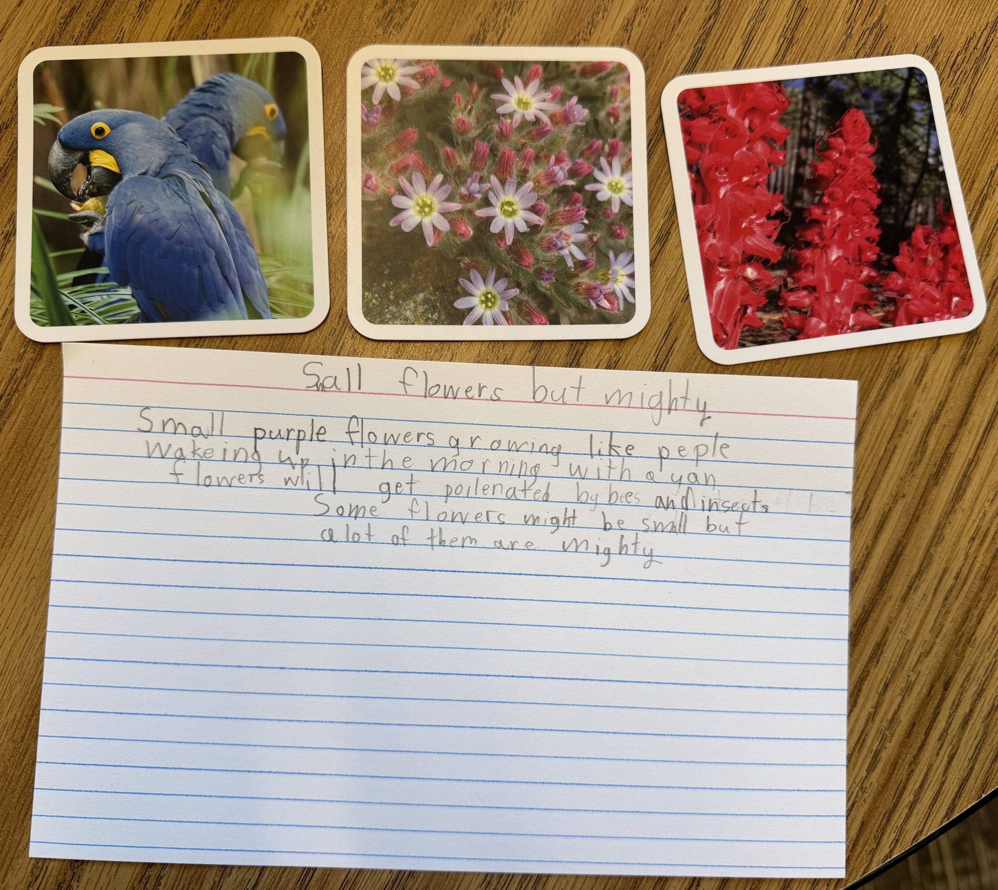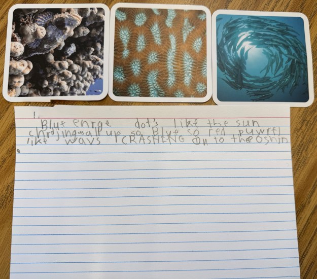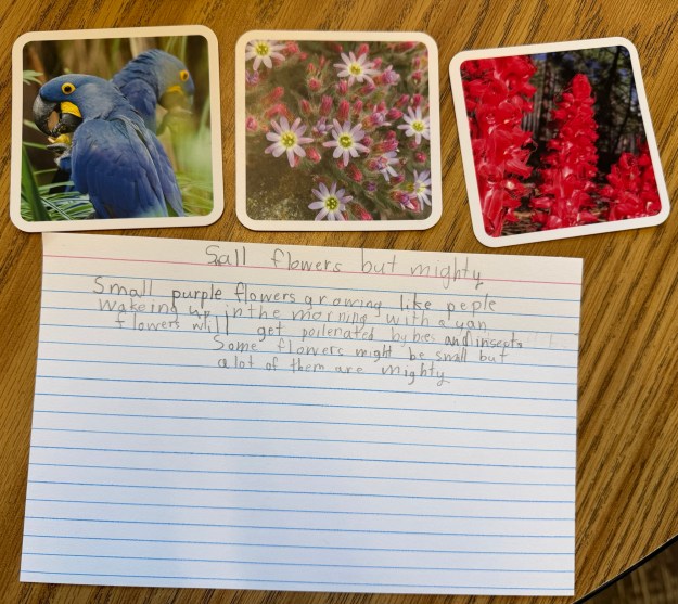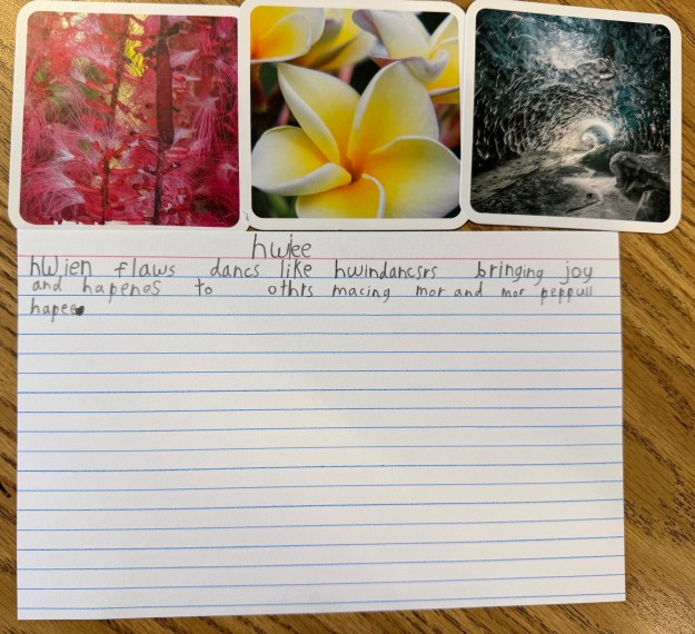 I introduced my first grade students to these cards as an opportunity to play. In small groups they examined cards, talked about the cards, noticed details, and started sorting them into categories. They enjoyed the photos and puzzled over what some of the photos represented. The next day, I brought the cards out again. This time, I asked students to pick three photos and use them as inspiration for a poem.
