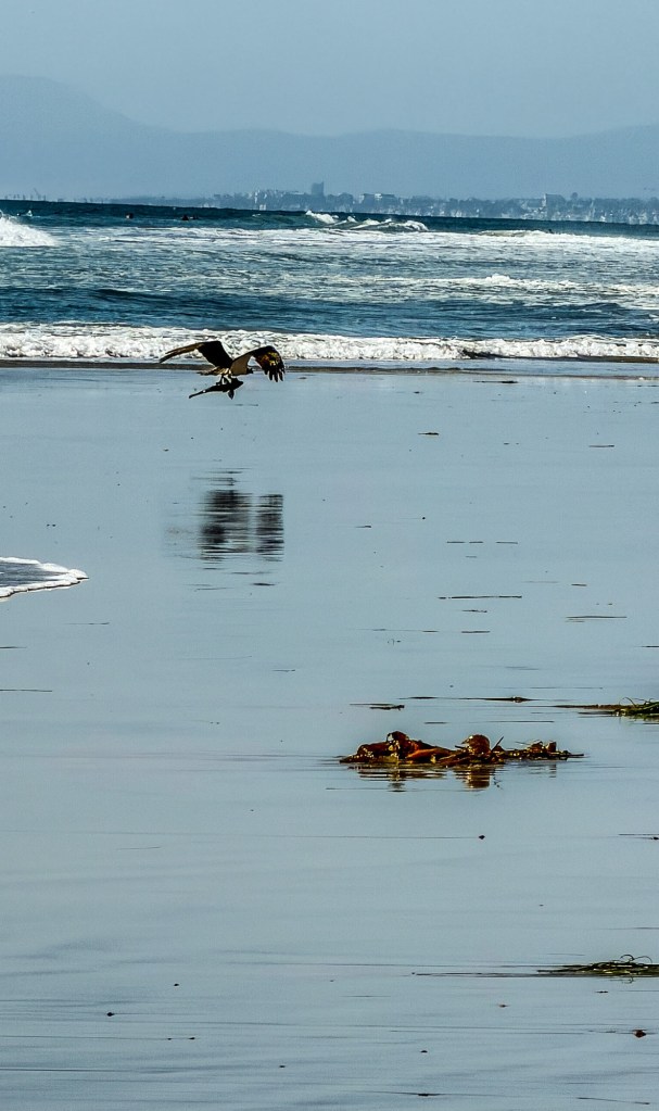 I caught the flicker of feathers out of the corner of my eye. Osprey! And then it dove. Wait, was that an osprey or a pelican? Then up it came with a fish in the talon–a big ol’ heavy fish. Down went the osprey, back into the water. I’ve never seen an osprey tread water–until today. It seemed to be riding the waves, flapping when the wave lifted, an enormous fish still firmly in its grasp. When up didn’t work, the next step was to surf in toward the shore. Using the fish as the surfboard, it glided onto shore. Then took a bit of time to adjust, not risking losing that prize dinner, before lifting off and heading north to find a place to sit and dine on fresh seafood.