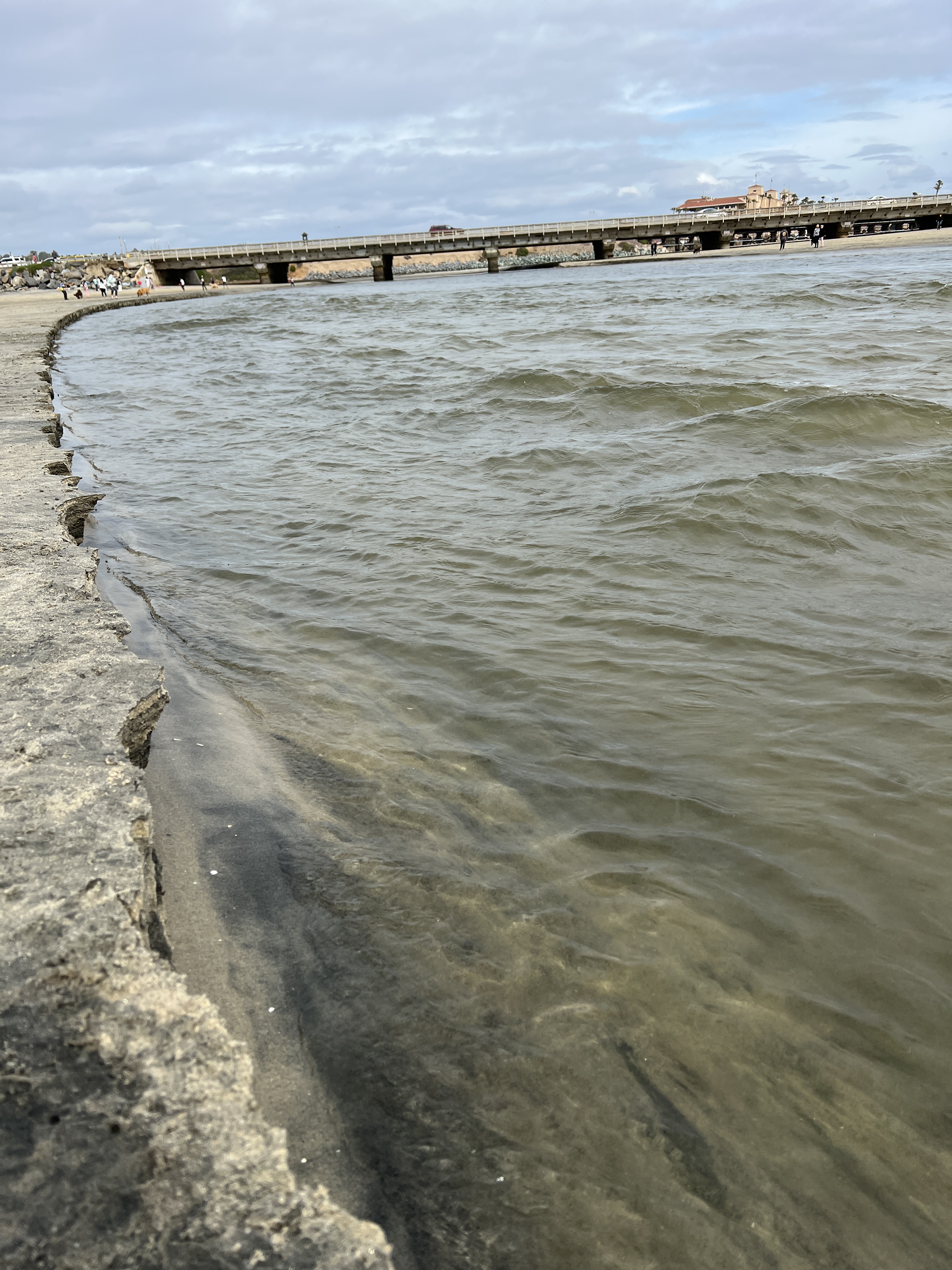 At the turn around point at Dog Beach, the channel that runs from the lagoon to the beach was full and running strong, creating a long curve angling from the bridge that also serves as part of the road along the coast. Just beyond it , if you look closely, you can see the horse racing grandstands at the Del Mar fairgrounds angled to have both a wonderful view of the horse racing as well as gorgeous color displays as the sun sets into the ocean.