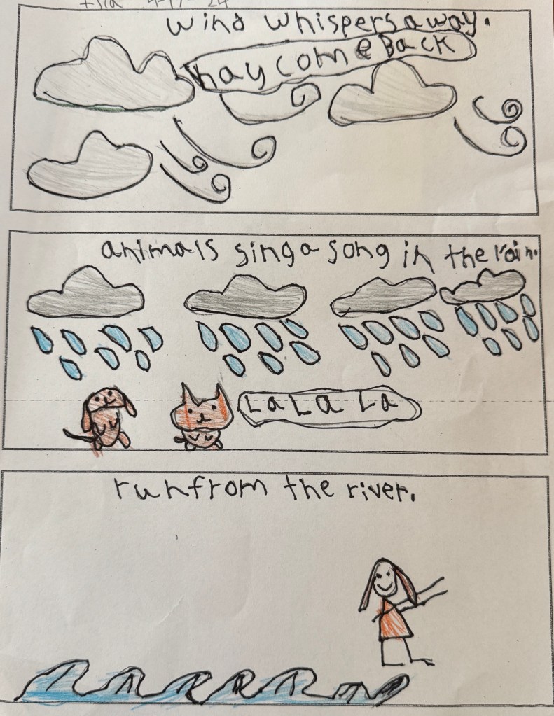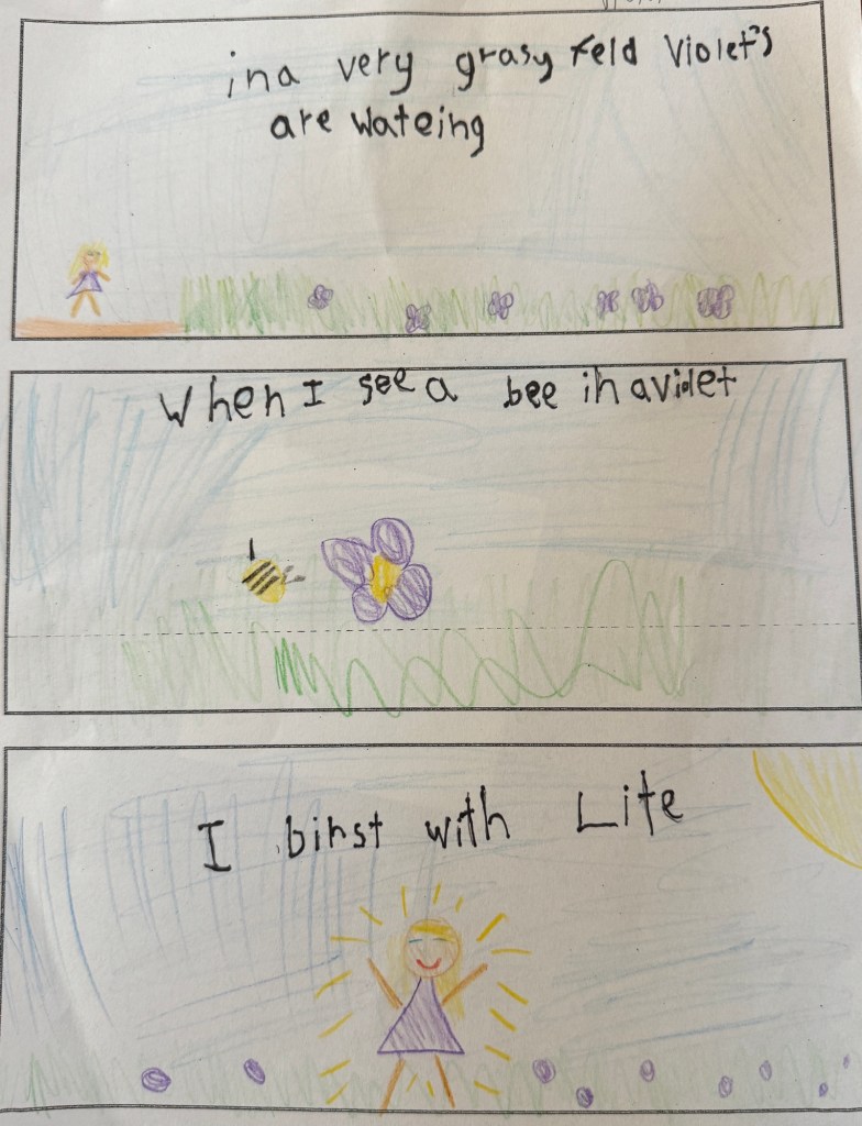 Studying Hines’ poem, we noticed words that were about cooking, expanding their understanding of recipe components. We underlined those words and drew illustrations for the poem before heading out for lunch. Time got away before we had time to write–but I kept my plan for writing in the back of my head to come back to when I had time.