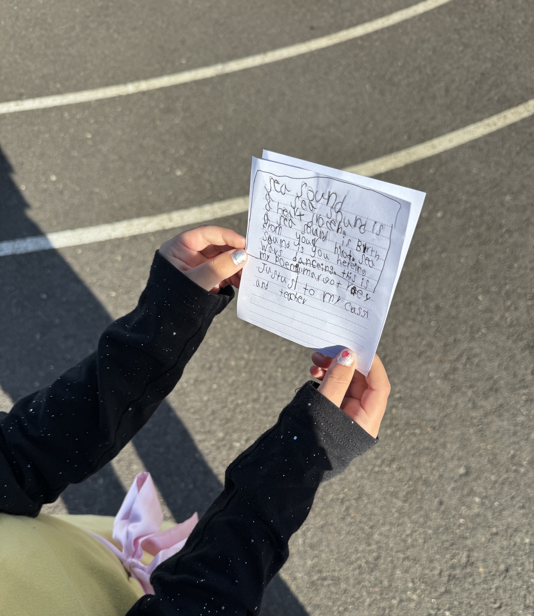 When I asked what inspired her to write, she responded, “It was the waves dancing.” She told me I could keep the poem and off she went to play with her friends before the school bell rang.