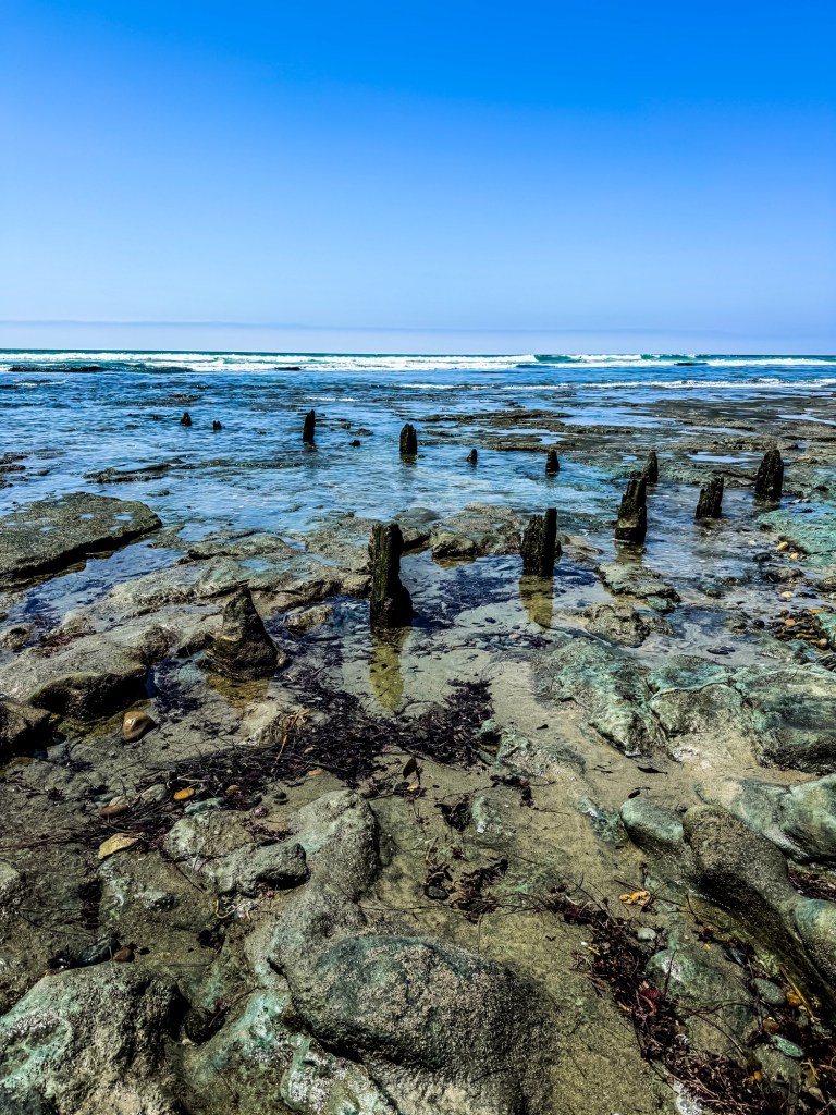 After a couple of vigorous games of beach paddleball, 8 year olds chasing waves in puffer jackets, swim trunks, and bare feet (typical winter beach attire), a tidepool mishap that resulted in a painful scrape and tears…and an early exit from the beach, we were left to our own devices. So we headed out to lunch where we discussed our need to still fit a walk into our day. We had resigned ourselves to walking our neighborhood until Geoff suggested heading back to the beach–one a couple of miles north of where we were earlier–to do our walking.