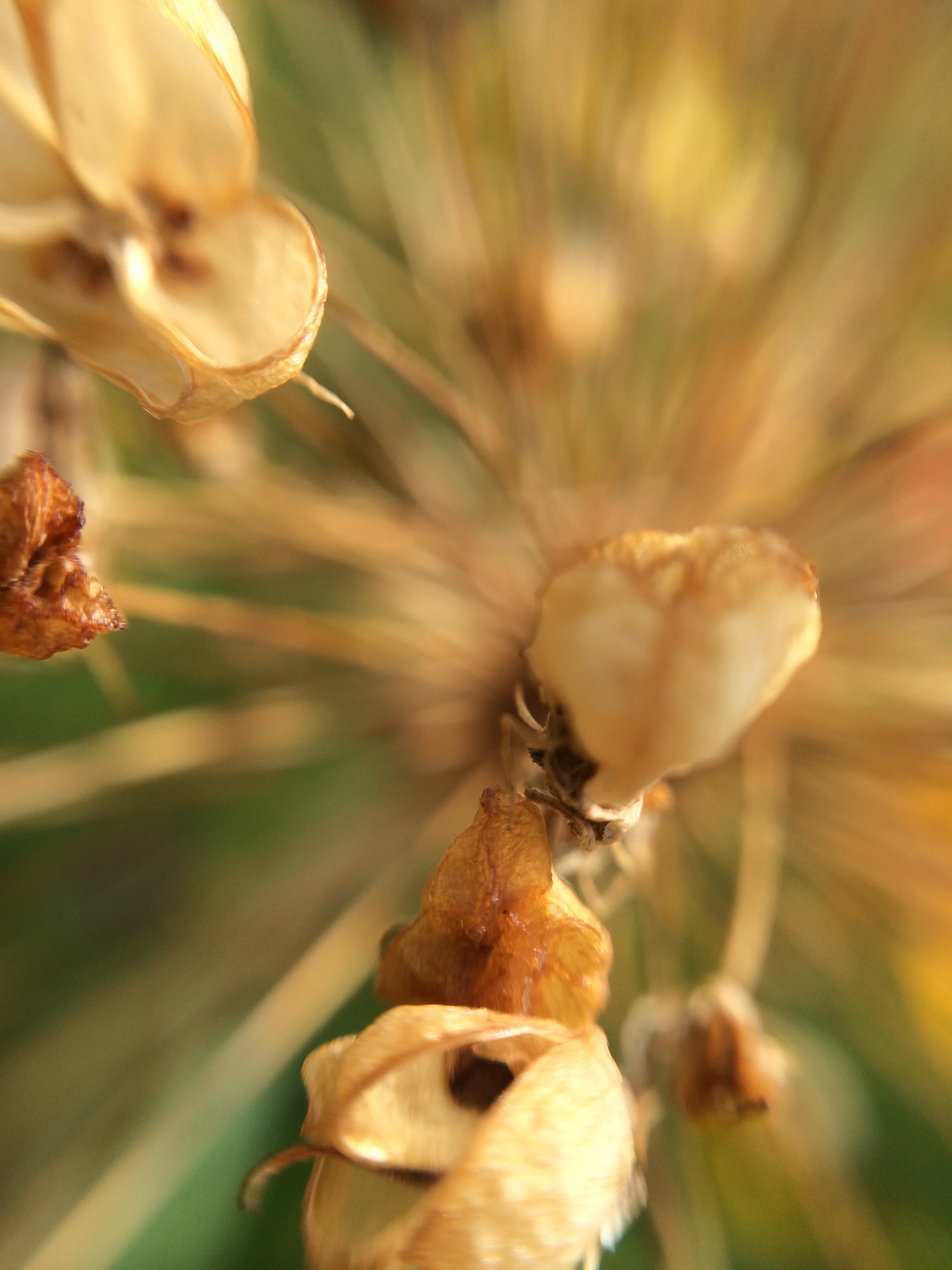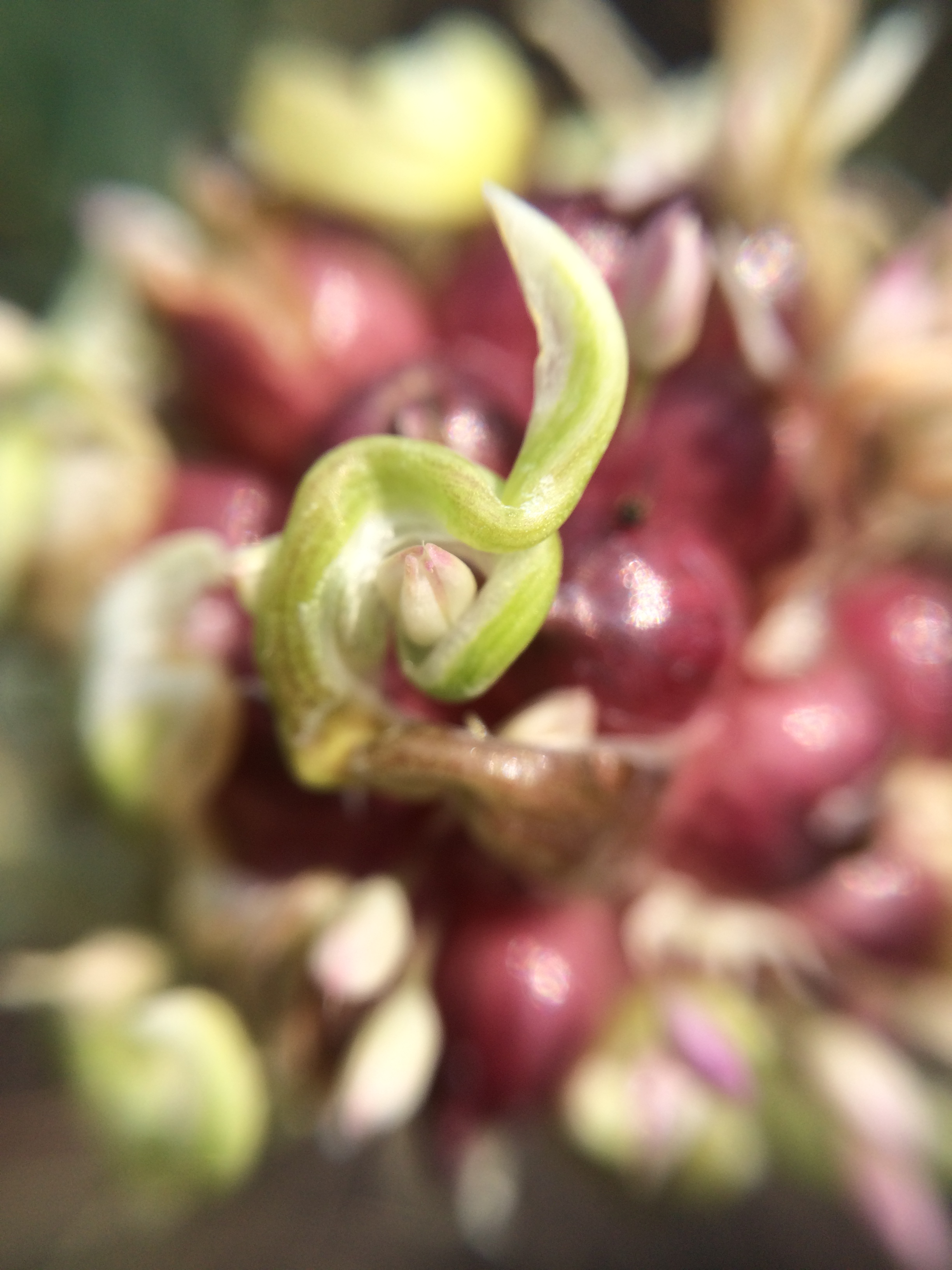 The macro lens on my iPhone is not particularly convenient, I have to take the cover off my phone and then attach the magnetic lens, so I don’t use it as frequently as I would like. Earlier this week I was in a beautiful garden…meant to be a replica of a homestead garden…in Bozeman, MT at the Museum of the Rockies. A bounty of flowers and vegetables flourished…calling my attention. There were poppies, sunflowers, and myriad flowers whose names I don’t know. And the onions were magnificent!