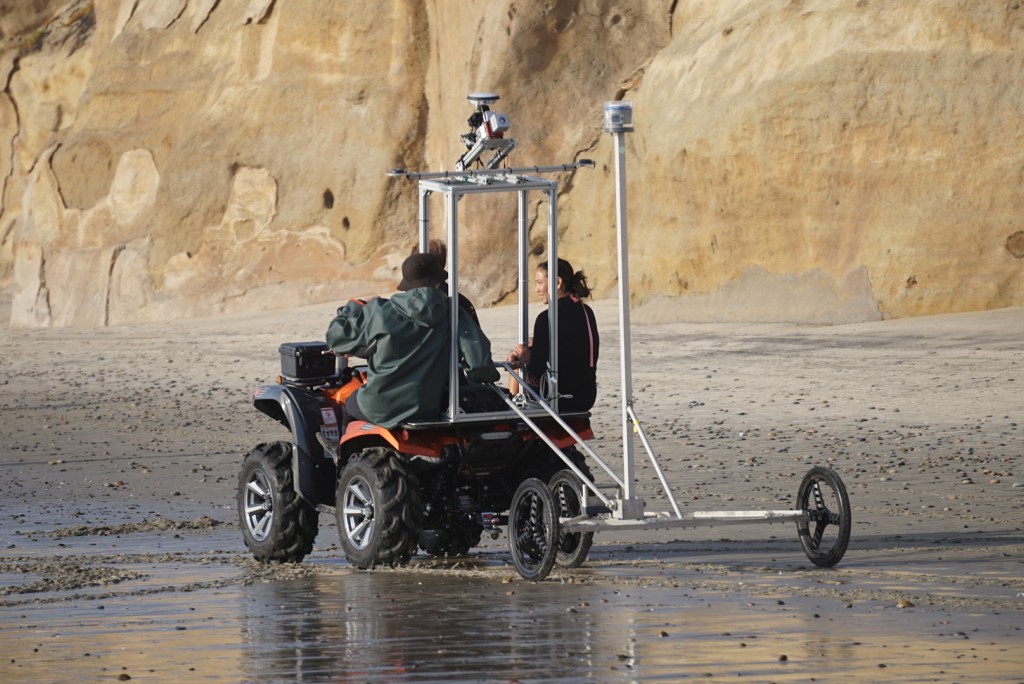 After a cliff failure (unfortunately this disaster happens all too often), research trucks with equipment mounted on the hood drives along the shoreline. And today, it was an ATV-like vehicle that seemed to have a camera or some other device mounted on it. It cruised up and down the coast, at times doing figure eights leaving deep ruts in the sea softened sand. At one point, the vehicle came back with another trailer-like device attached on the back. What kind of data were they collecting?