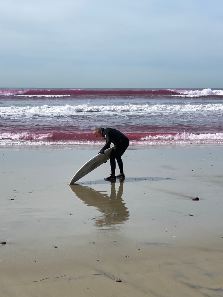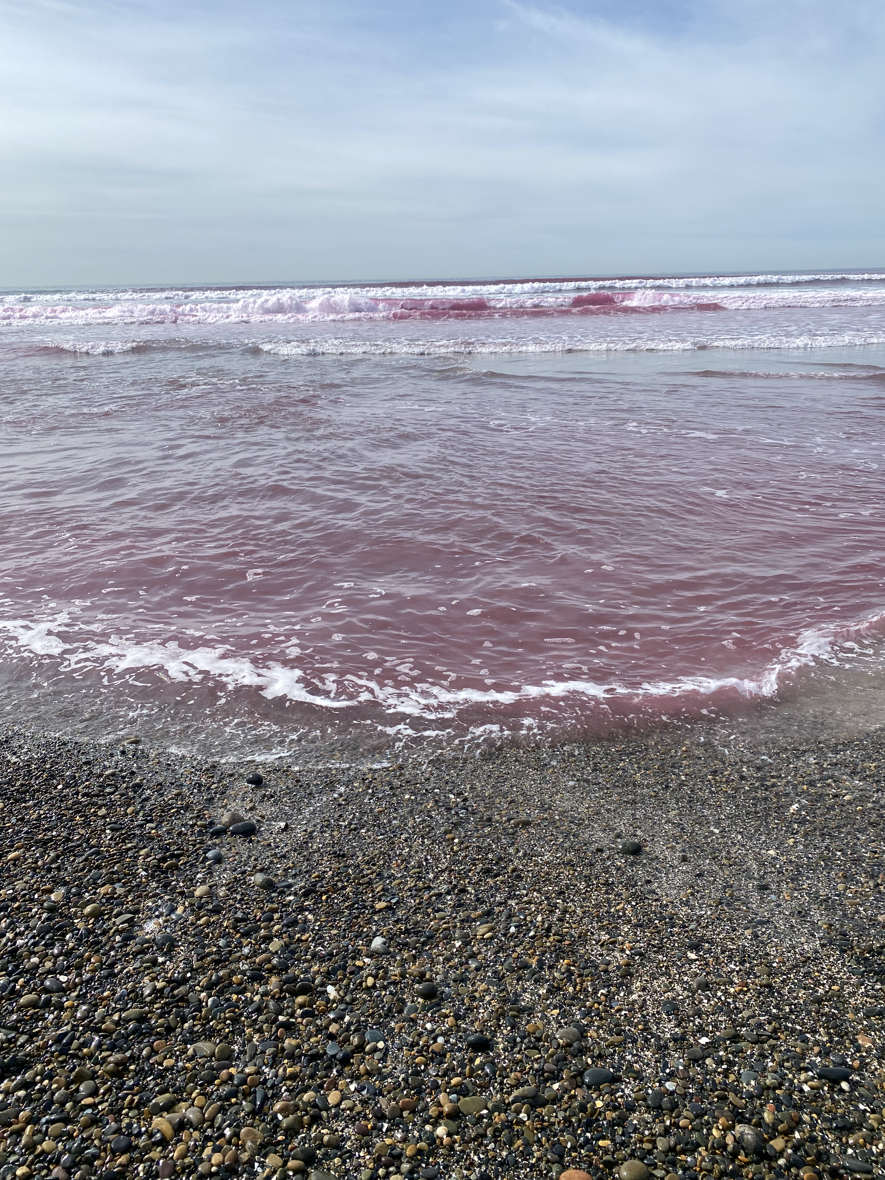 Recently, UCSD researchers have been conducting research where they put non-toxic pink dye in the river mouth that leads to the beach so they can document how the water moves. (I’m sure there are many more details involved, you can read more about it here.). Luckily, on one of the dye dumping days, my husband happened to be at that beach and snapped a few pics.