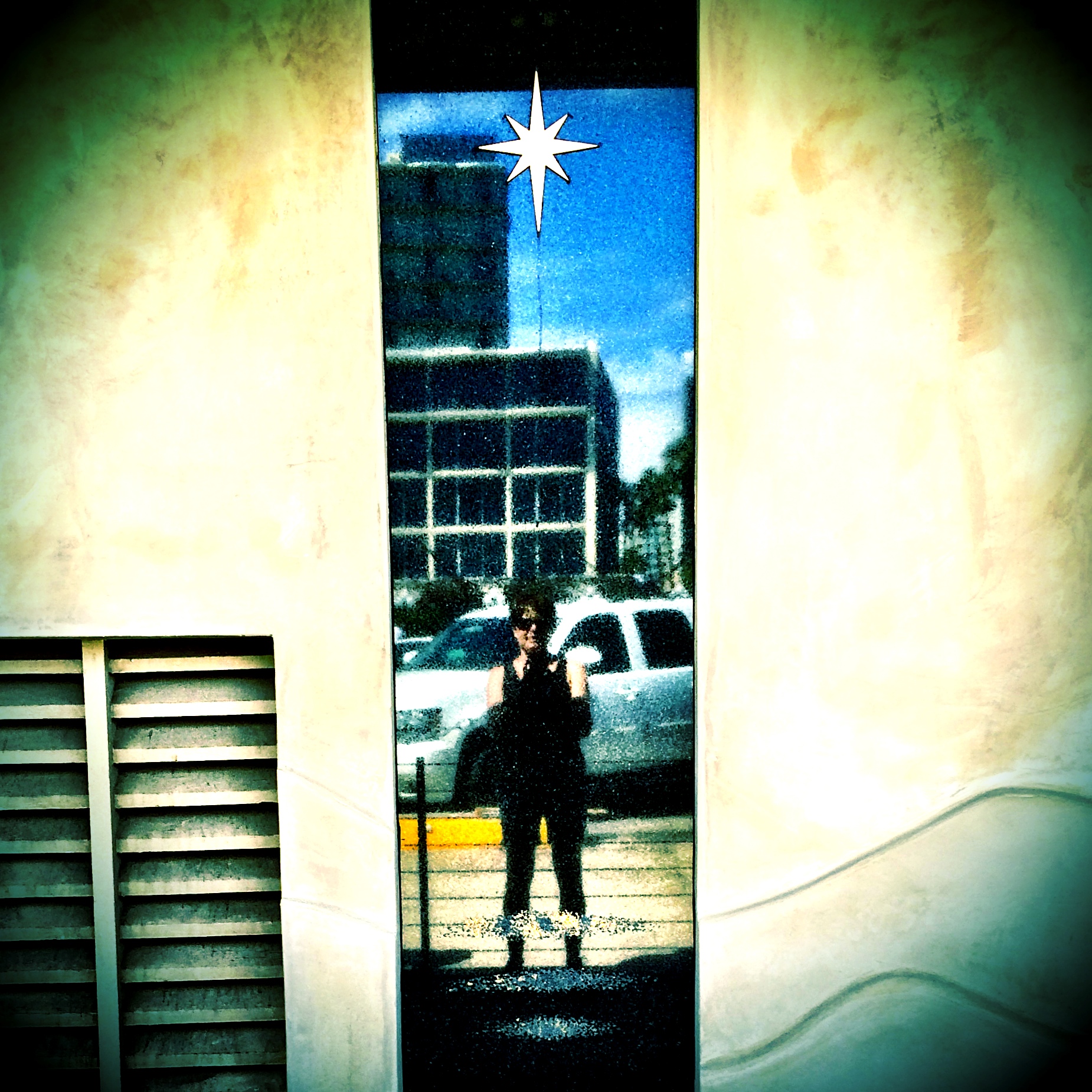 Geoff noticed this star on a window of a restaurant as we headed back toward where we had parked our car, so of course I had to stop to snap a photo.  The long skinny window makes an interesting frame for the self portrait.