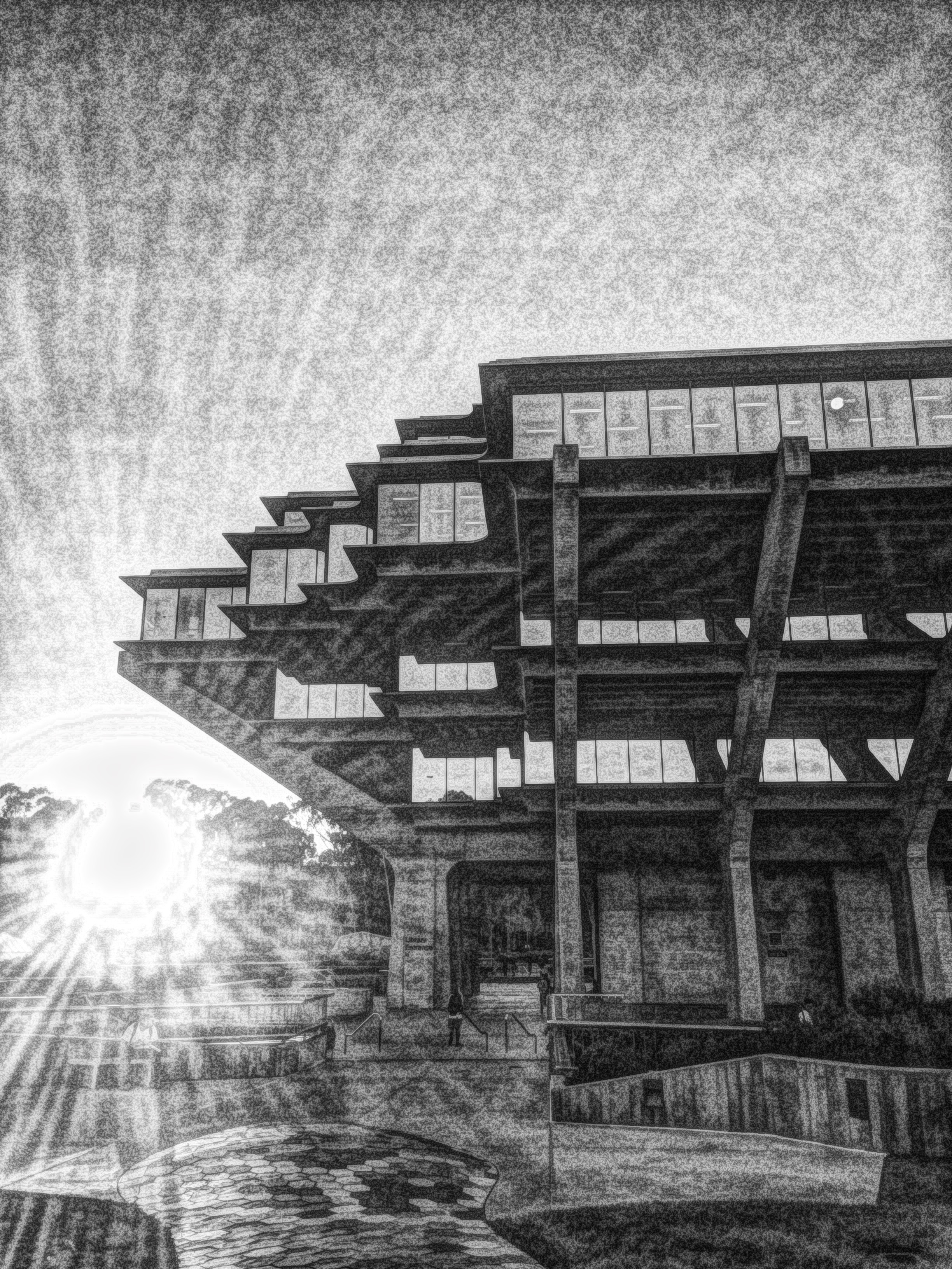 The Geisel Library at UCSD is such an architecturally interesting building that I couldn’t resist framing some shots. You can see the sun setting behind the building in this shot focused toward the west. Again, I changed it to black and white, creating lines of light framing the building.