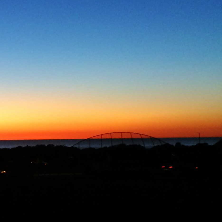 Yesterday I was at school late, after all, it is report card season. And it’s hard to stay focused on work as the classroom gets darker and darker as the sun sets. About a half hour after the sunset, my teaching partner and I headed out…and looked out toward the end of the hall and saw the most incredible colors in the sky. Brilliant oranges sat on the deep turquoise sea, and even as I took the time to snap a few images I knew that my camera would not do justice to the intensity of the colors.