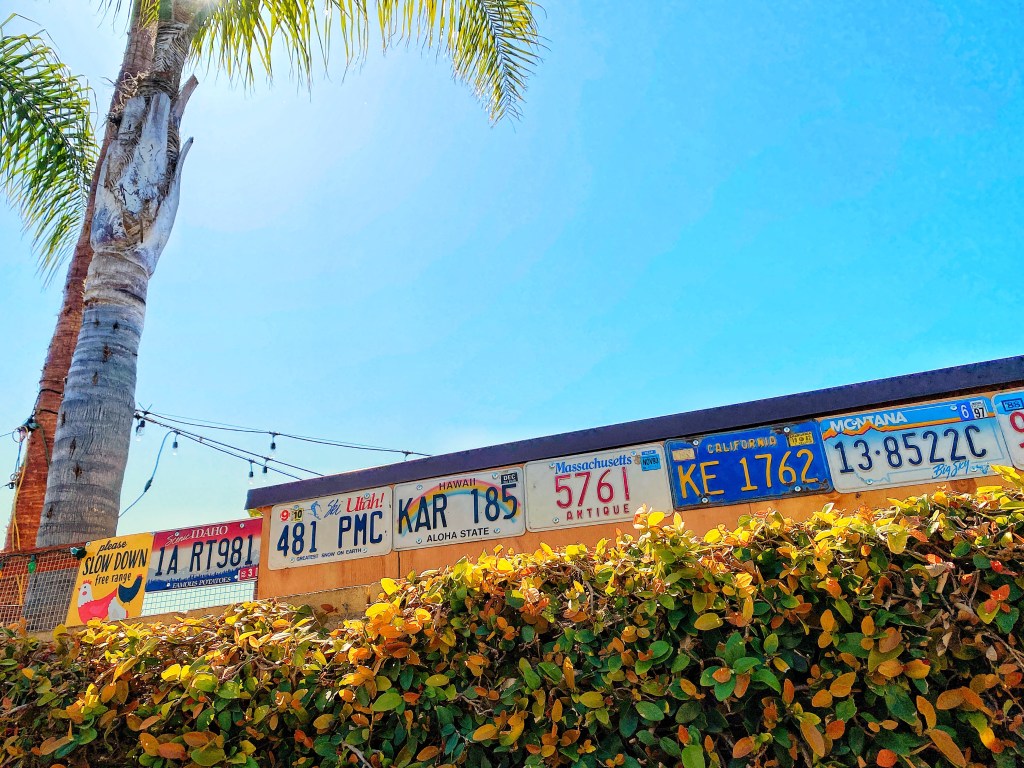 This week I noticed that a neighbor has a structure that peeks out above their hedge. Maybe the structure had always been there–but this week I noticed that it is adorned with license plates. Utah, Hawaii, Massachusetts, California, Montana… Is this a license plate collection? A record of places lived? Cars owned? A lot bid on and won from an online auction? And what is the structure? A pergola? A shed? A chicken coop?