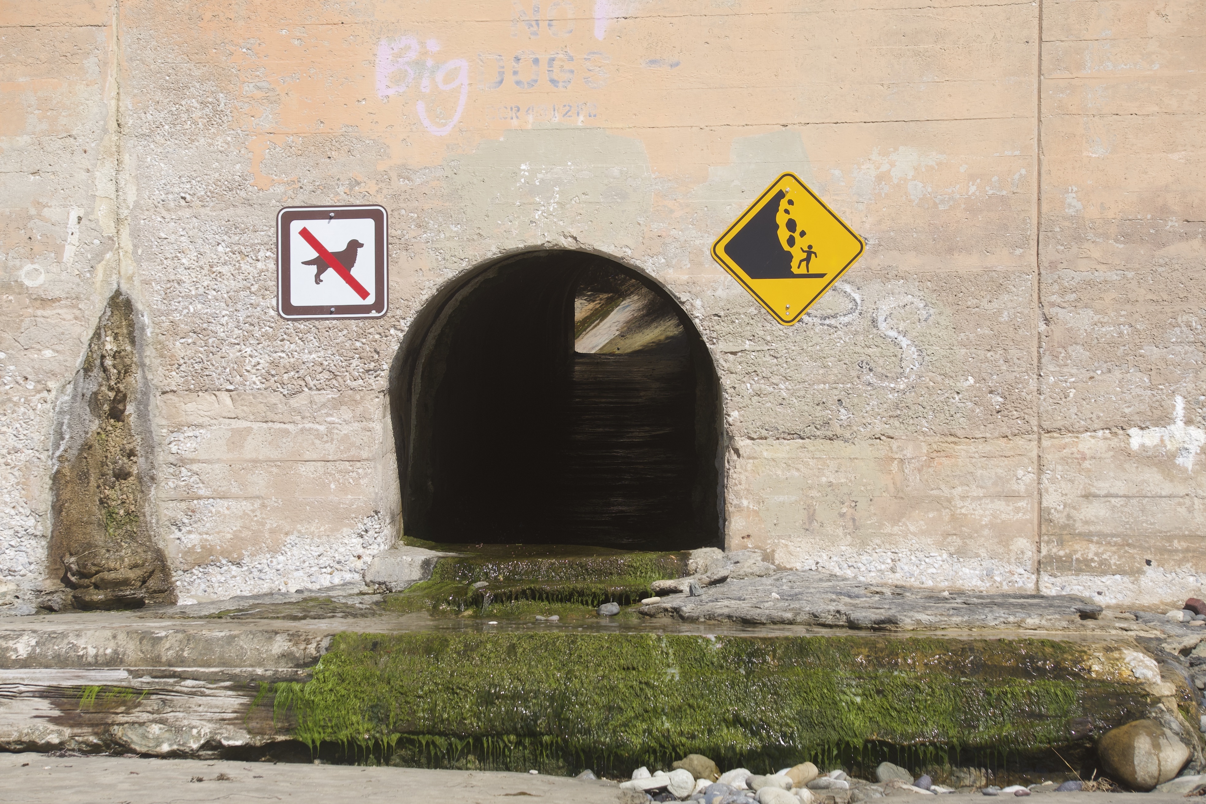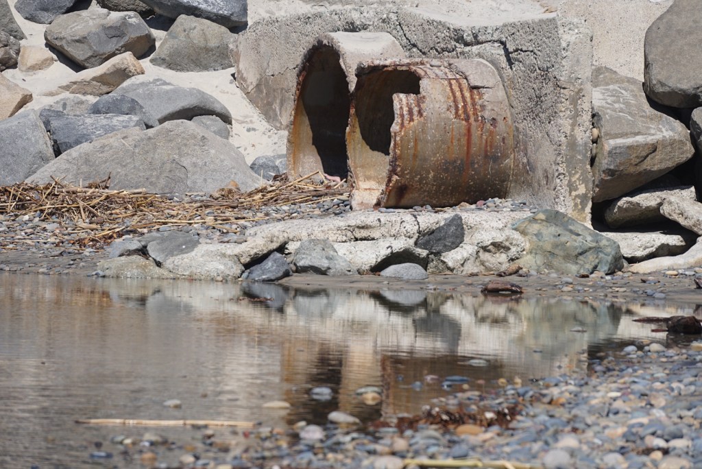 My favorite beach is just a few miles from home and you can find me there several days a week walking and exploring the shore with my camera. Today I noticed that the pipes that bring run off to the ocean are looking pretty raggedy and that the usual free flowing river mouth is pooled up, blocked by lots of small rocks. I’m wondering if nature will clear the blockage or if the city will need to intervene and bring in some large equipment to keep the healthy flow moving in and out with the tides.