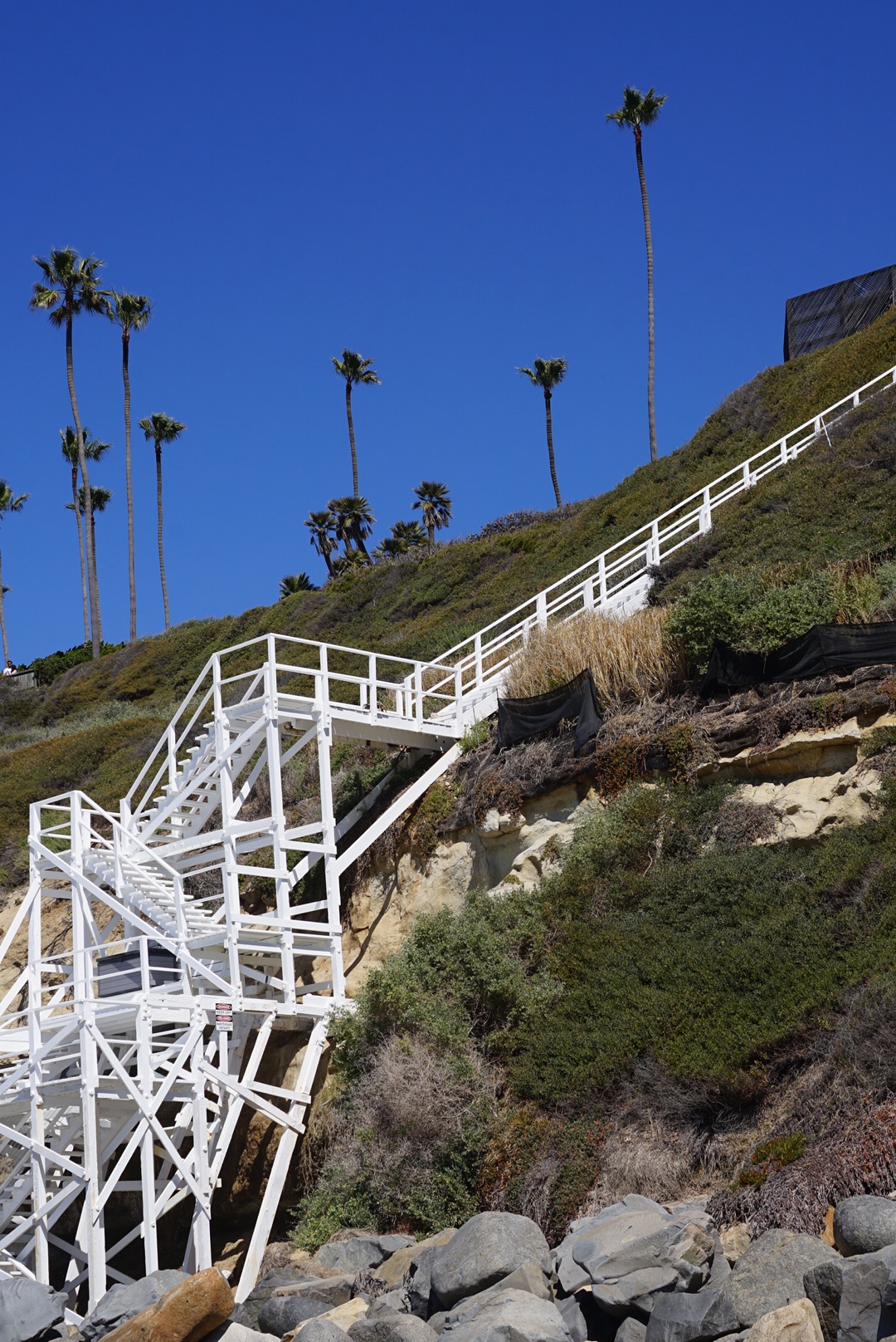 Further down the beach I noticed how white the stairs look against the brilliant blue of the sky. I always think of these stairs as a stairway to nowhere. But actually they lead to the Self-Realization Fellowship gardens. They are not accessible from the beach and there are signs warning people to stay off. But they are also maintained, regularly repaired and painted–a necessity with daily exposure to the elements near the ocean. So I guess they do go somewhere–I wonder if anyone from above uses them to access the beach.