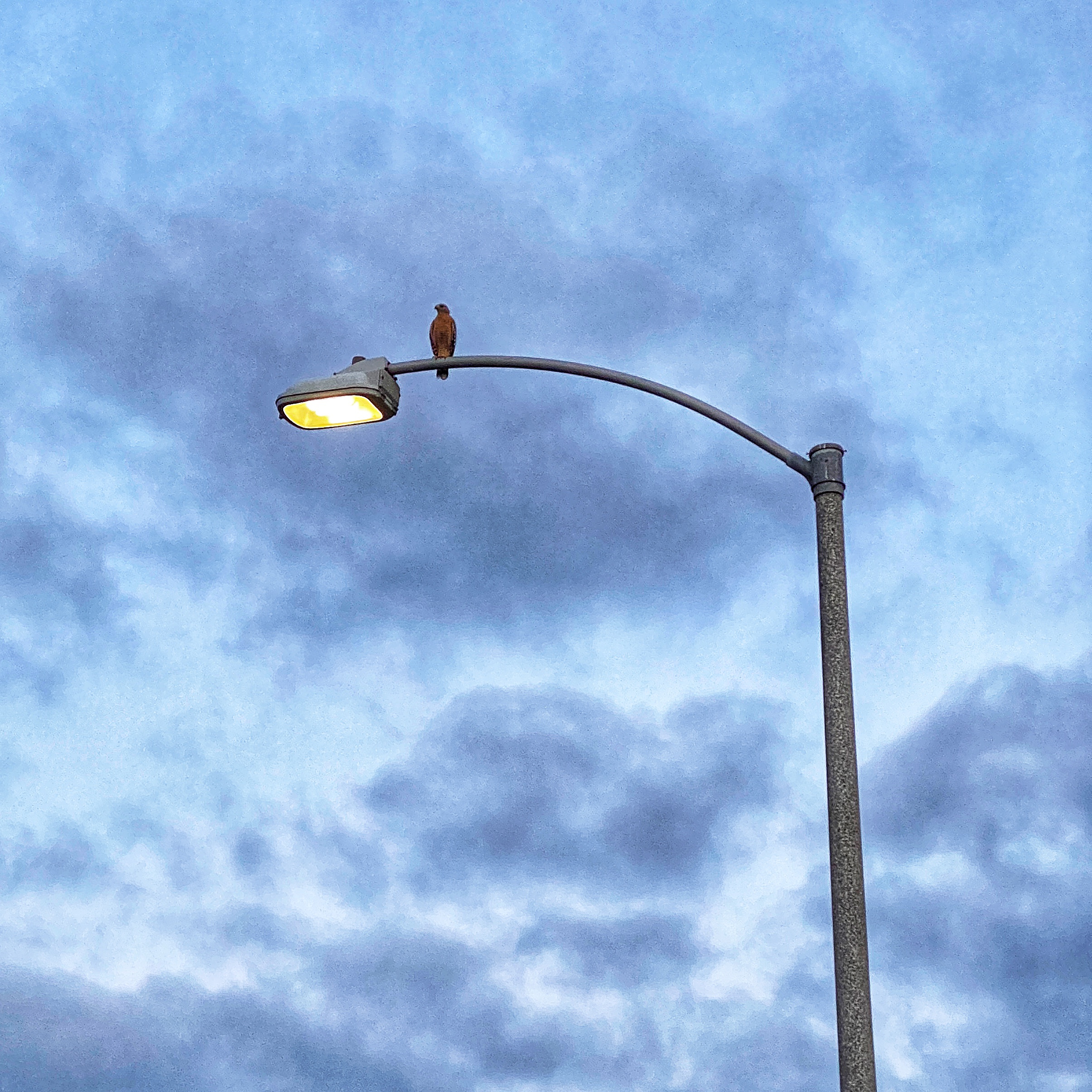 Some days I notice birds. The most common are of the corvid species–crows and ravens who converse raucously from the treetops. Today I spied a small bird of prey perched on the lamppost…watching the world while I watched it. I always wonder what those wonderful wild bird think from their suburban perch. Do they notice the carefully groomed yards, the small dogs in cute sweaters on reel-in leashes, the tweens on electric bikes buzzing down the sidewalks?