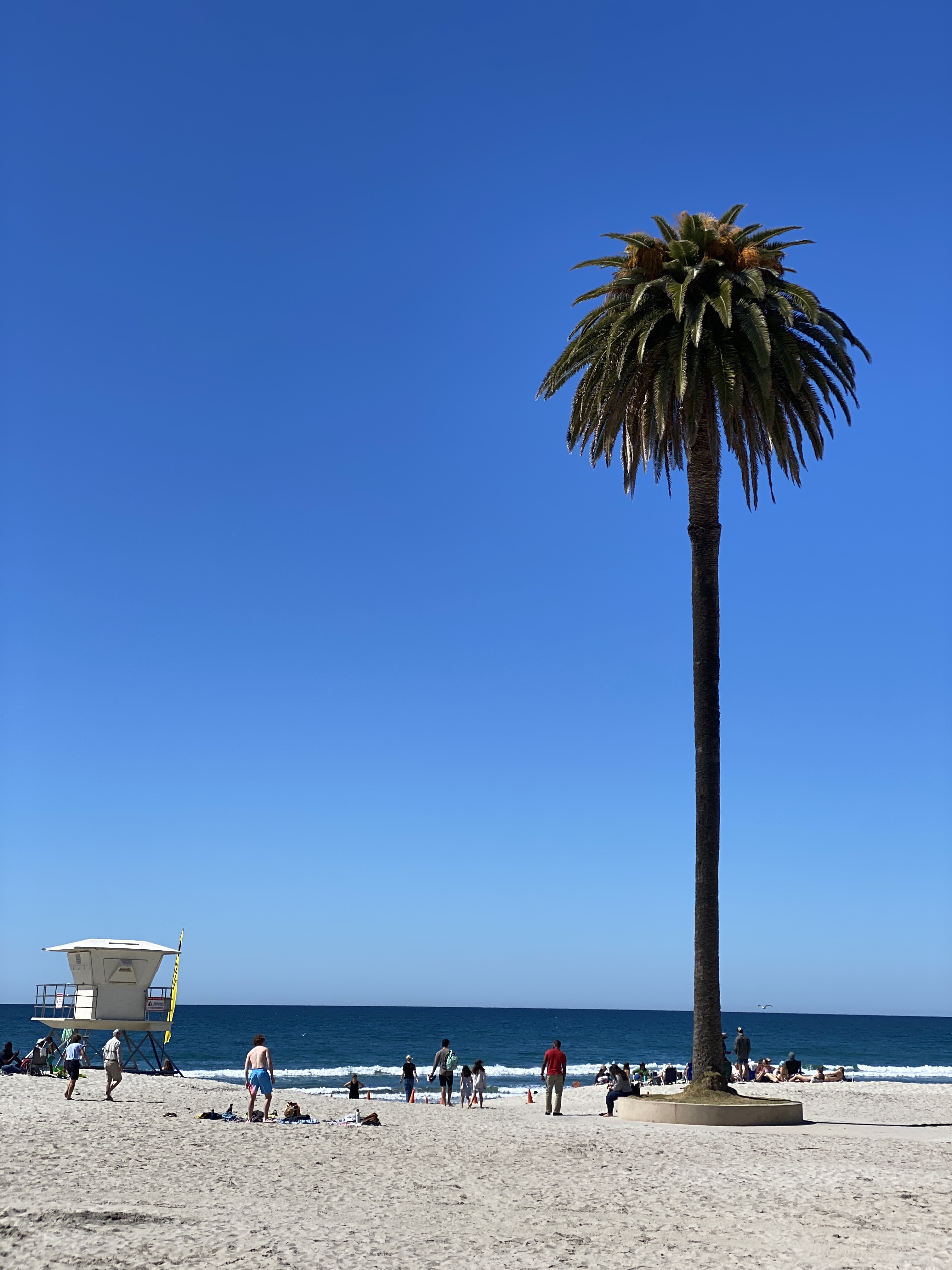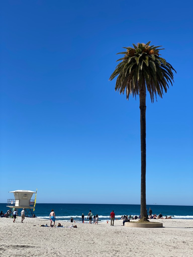 Heading back to my car, I took a picture I take often. There is an iconic palm tree in the walkway down to the beach. It’s big and bold…and is beautiful against the blues of the waves and the sky. I frequently frame the image with the lifeguard tower in view. And yes, the day was warmer today. I think it even got to 70, which means that people were in swim suits, sunbathing, playing on the shore and in the waves. It’s not warm enough for me yet–but some go with the theory that sun=warm, so off go the jackets and lots of skin is visible.