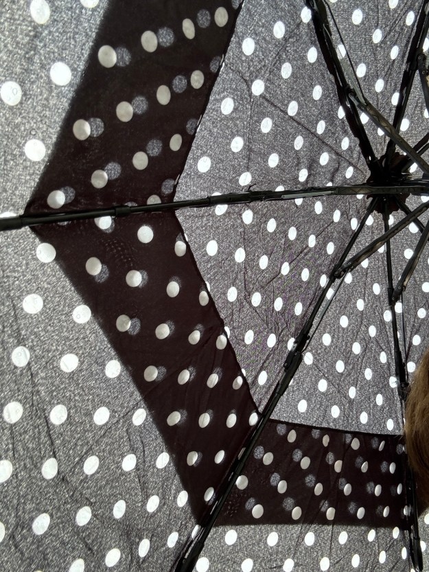 But instead, since the rain had lessened, I was determined to take an outdoor walk. So when I got home, I switched over to a lighter raincoat (the one I had worn to work today felt too heavy for a walk), reminded my husband that he didn’t have to come with me in the rain, and got ready to head out. But Geoff being Geoff, grabbed an umbrella and encouraged me to grab mine…and then we headed out for a rainy day walk.